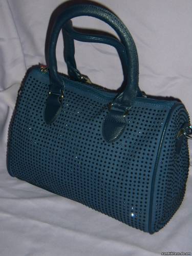 808, сумка-бочонок из цветного брезента и цветной прессованной кожи со стразами, длинная ручка,размер (300*220*150), цвет синий