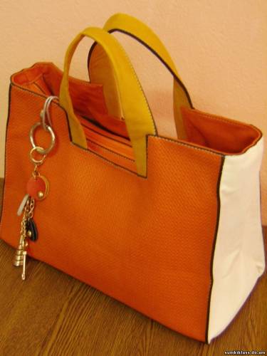 2205 ,сумка из цветной прессованной перфорированной кожи ,3 отделения,есть длинная ручка, размер (350*250*140) цвет оранж+кремовый+светло-коричневый