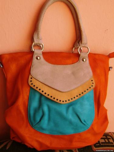 Bornie 52397-1 ,сумка из цветной прессованной кожи ,есть длинная ручка, размер (350*350*100), цвет апельсин+бирюза+беж+коричневый