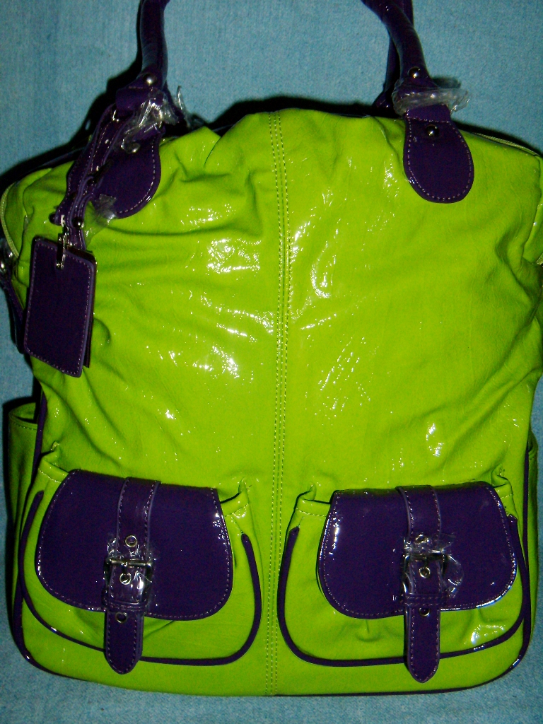 12005 ,сумка прессованного лака , 2 отделения, длинная ручка,цвет (кислотно-зелёный+ фиолет), размер 300*380*150